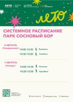 Парк «Сосновый бор» (Озёры) — понедельник, 4 августа, с 14.00 до 15.00; четверг, 7 августа, с 14.00 до 15.00; суббота, 9 августа, с 11.00 до 13.00.