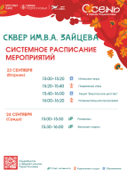 Сквер имени В. А. Зайцева (Коломна) — вторник, 23 сентября, с 15.00 до 16.20; среда, 24 сентября, с 15.00 до 16.00.