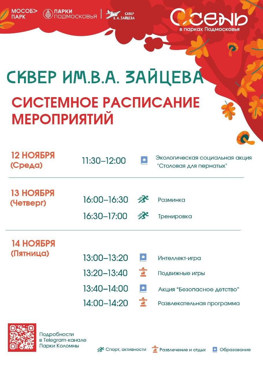 Сквер имени В. А. Зайцева (Коломна) — среда, 12 ноября, с 11.30 до 12.00; четверг, 13 ноября, с 16.00 до 17.00; пятница, 14 ноября, с 13.00 до 14.20.