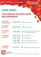 Парк Мира (Коломна) — вторник, 11 ноября, с 9.00 до 9.30; среда, 12 ноября, с 10.00 до 10.30; суббота, 15 ноября, с 9.00 до 9.50 и с 16.00 до 17.20.