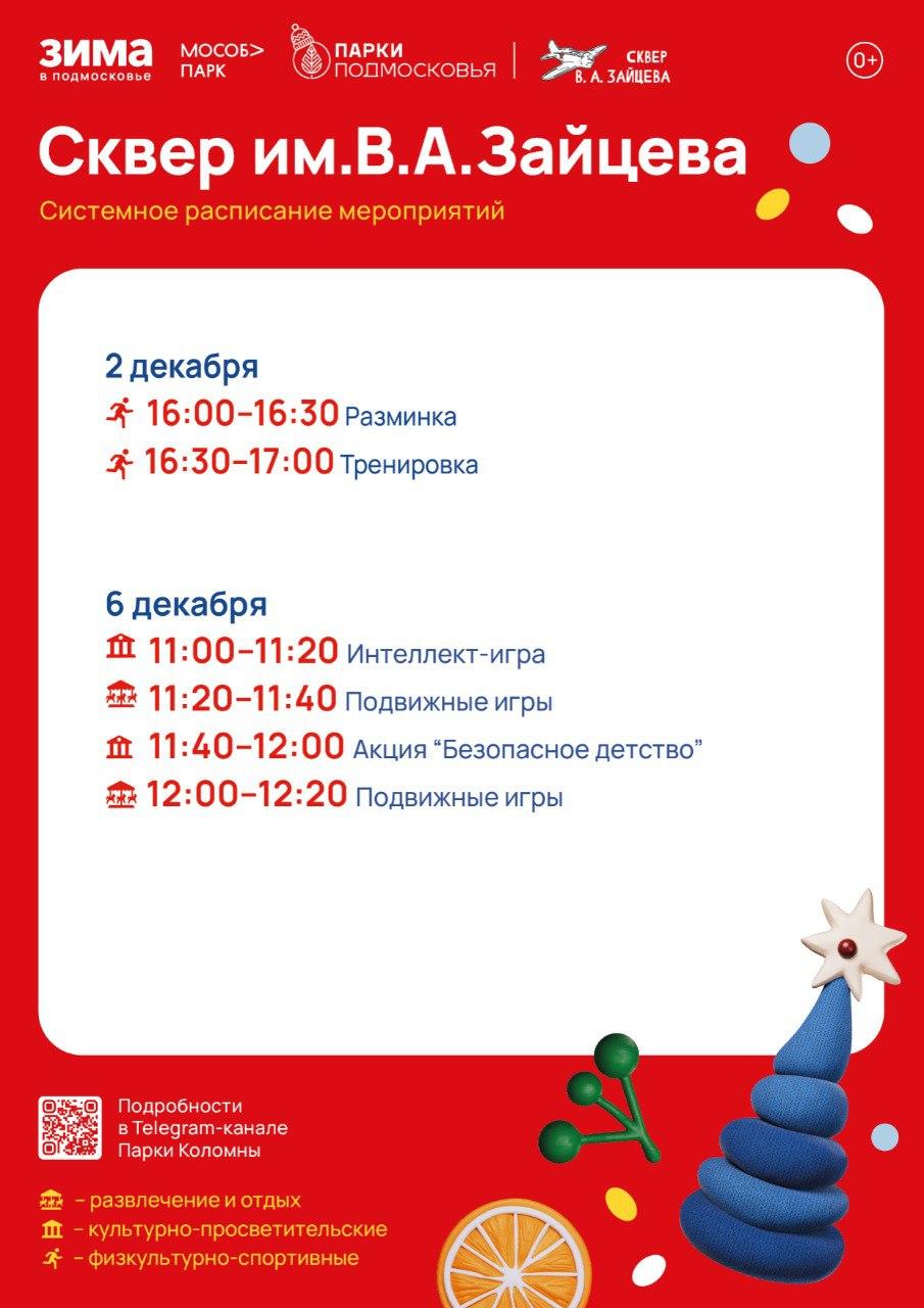 Сквер имени В. А. Зайцева (Коломна) — вторник, 2 декабря, с 16.00 до 17.00; суббота, 6 декабря, с 11.00 до 12.20.