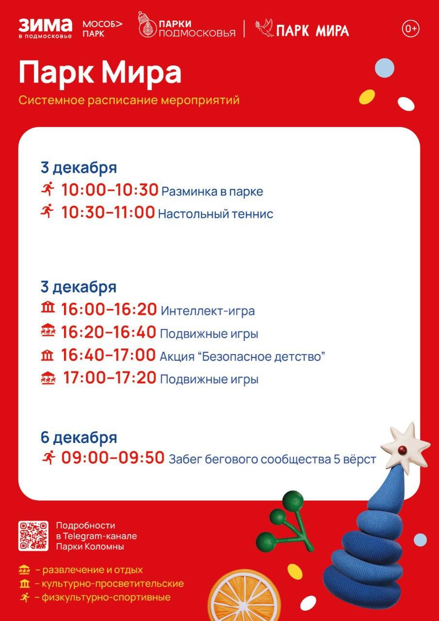 Парк Мира (Коломна) — среда, 3 декабря, с 10.00 до 11.00 и 16.00 до 17.20; суббота, 6 декабря, с 9.00 до 9.50.
