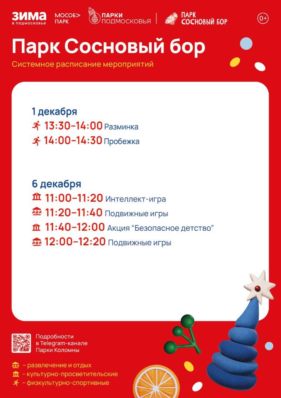 Парк «Сосновый бор» (Озёры) — понедельник, 1 декабря, с 13.30 до 14.30; суббота, 6 декабря, с 11.00 до 12.20.