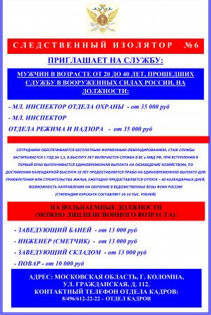 О приёме на службу в ФКУ СИЗО-6 УФСИН России по Московской области