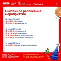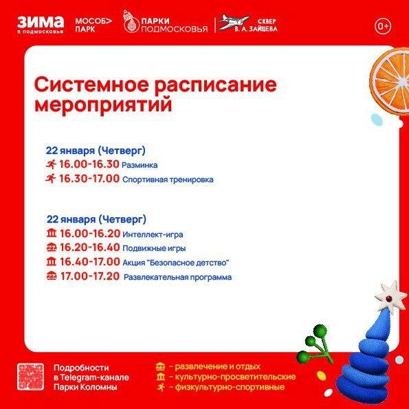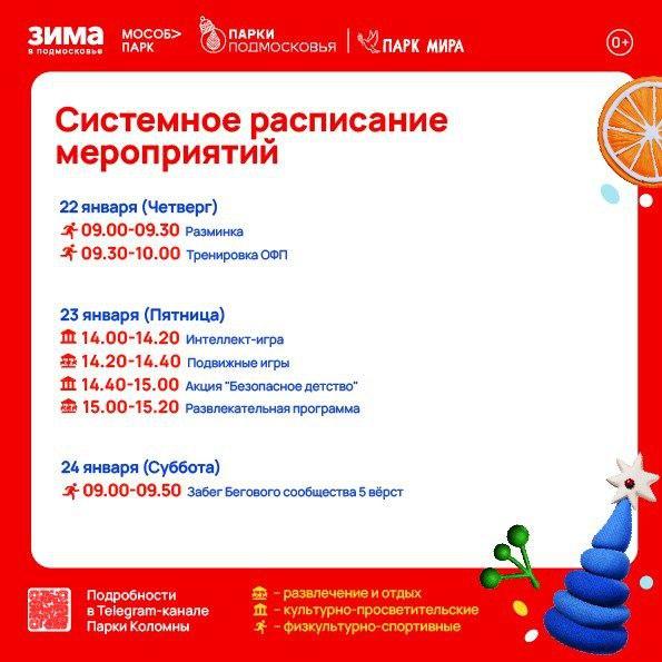 Парк Мира (Коломна) — четверг, 22 января, с 9.00 до 10.00; пятница, 23 января, с 14.00 до 15.20; суббота, 24 января, с 9.00 до 9.50.