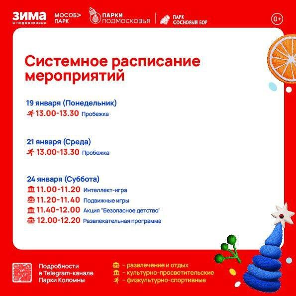 Парк «Сосновый бор» (Озёры) — понедельник, 19 января, с 13.00 до 13.30; среда, 21 января, с 13.00 до 13.30; суббота, 24 января, с 11.00 до 12.20.
