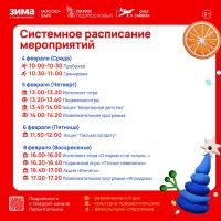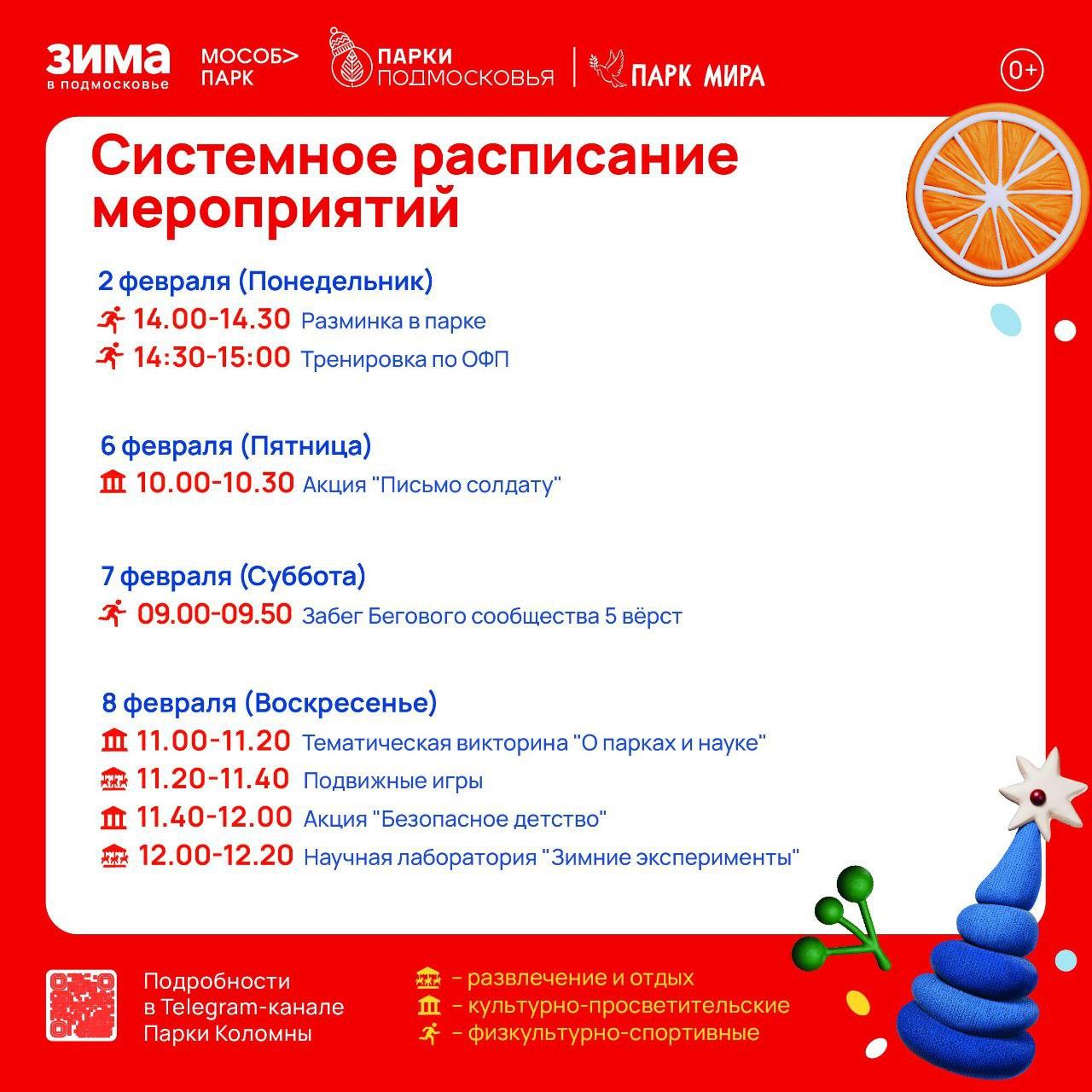 Парк Мира (Коломна) —понедельник, 2 февраля, с 14.00 до 15.00; пятница, 6 февраля, с 10.00 до 10.30; суббота, 7 февраля, с 9.00 до 9.50; воскресенье, 8 февраля, с 11.00 до 12.20.
