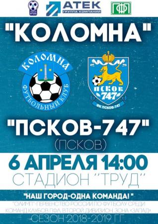 6 апреля в 14-00 на стадионе «Труд» в рамках календарного матча Первенства России 2 дивизиона зоны «Запад» Футбольный клуб «Коломна» встречается с командой «Псков-747» из города Псков.