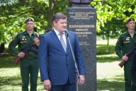 27 мая в Мемориальном парке в Коломне открыли бюст выдающемуся конструктору стрелкового оружия Михаилу Калашникову. На торжественном митинге присутствовали глава Коломенского городского округа Денис Лебедев, дочь конструктора Елена Калашникова, депутат Мособлдумы Алексей Мазуров, сотрудники КБМ, представители администрации, военнослужащие коломенского гарнизона, юнармейцы.