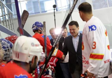 Губернатор Московской области Андрей Воробьёв обратился к присутствующим с приветственным словом и дал старт матчу, совершив вбрасывание шайбы.