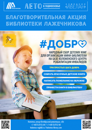 Все мы – разные. Зачастую мы исповедуем диаметрально противоположные политические, религиозные, социальные и экономические убеждения, но всех нас объединяет одно: стремление к тому, чтобы наши дети жили в более справедливом и милосердном мире. Мы часто сталкиваемся с дилеммой: должен ли я помогать постороннему? протянут ли руку помощи мне, когда я окажусь на перипетии? Разумеется, это лишь дело совести, выбор свободного человека, но благодаря таким, на первый взгляд, ничего не значащим поступкам иногда кардинально меняются судьбы нуждающихся. Благотворительная акция по сбору книг #Добро направлена на то, чтобы создать мини-библиотеку для воспитанников Коломенского центра реабилитации инвалидов. Мы не попросим у Вас денег, лишь несколько минут свободного времени.