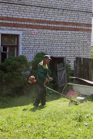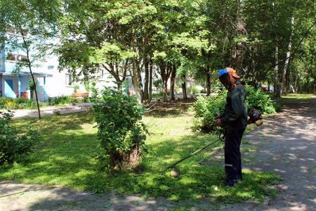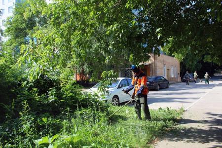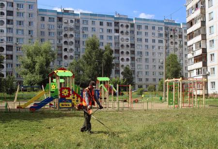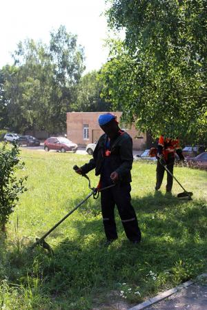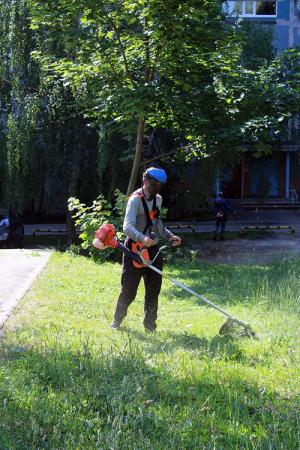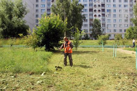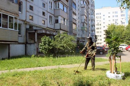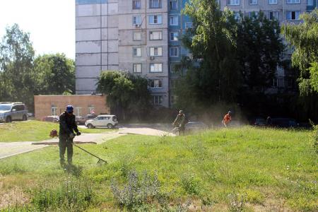 Служба благоустройства ООО «Департамент городского хозяйства» производит окос травы на придомовых территориях. Рабочие зелёного строительства и рабочие по благоустройству приводят в порядок газоны во дворах.