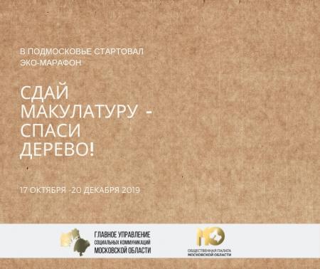 С 17 октября по 20 декабря 2019 года на территории Московской области пройдет Эко – марафон ПЕРЕРАБОТКА «Сдай макулатуру – спаси дерево!». Организатор эко-марафона: Общественная палата Московской области при поддержке Главного управления социальных коммуникаций Московской области.
