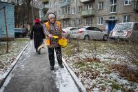 Дворник РЭУ «Репинский» Любовь Толстикова щедро набирает совком из ведра пескосоляную смесь - традиционное средство против гололёда. Она быстро посыпает дорожку этим средством.