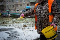 В первую очередь противоголёдную обработку дворники проводят возле подъездов и на тротуарах, и только потом приступают к внутриквартальным проездам. Зимой в сложных погодных условиях работа начинается затемно.