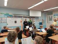Сотрудники полиции напомнили школьникам о правилах перехода проезжей части дороги и правилах езды в общественном транспорте, а также о необходимости носить световозвращающие элементы.