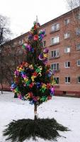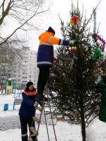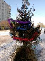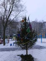 Яркие фольгированные гирлянды и мишура — вот главные украшения зелёных хвойных красавиц, установленных во дворах. Никакого бьющегося декора или электрических фонарей. Технология создания праздничного настроения у сотрудников ООО "ДГХ" отработана и проверена годами.
