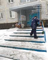 Первый рабочий день в этом году дворники ООО "ДГХ" начали с посыпки реагентами обледеневших тротуаров и выходов из подъездов.