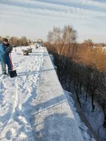 - Убираем снег на плоских кровлях пяти- и девятиэтажек, - рассказывает начальник участка общестроительных работ ООО "ДГХ" Андрей Сучков. - Необходимо очистить примерно метр от парапета, чтобы талая вода не затекла в примыкание. На некоторых домах со скатной кровлей есть ограждения. На такие крыши могут выходить наши промышленные альпинисты. Работают они в паре, страхуют друг друга. Спускаются к краю, сбивают сосульки и чистят метр по периметру свесов.