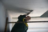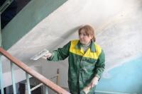 Слой старой штукатурки с лёгкостью отстаёт от потолка. Маляр Департамента городского хозяйства Татьяна Полякова ловко орудует шпателем. Хлопья побелки осыпаются на пол, ложатся на перила, частично остаются на стенах. Это сейчас по подъезду страшно пройти, но уже в скором времени здесь будут чистота и уют.