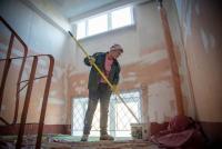 Полы подъезда в местах активной работы бригада застелила старой тканью.