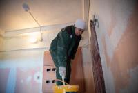 Штукатур Департамента городского хозяйства Валентина Соколова с напарницей красят белой краской потолок и верхнюю часть стены в шестом подъезде дома 44 по улице Щуровской.