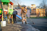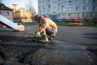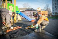 Рабочие быстрыми движениями разравнивают черные гранулы по всей поверхности игровой площадки. Кто-то орудует широким деревянным строительным правилом, а кто-то утрамбовывает состав разогретым ручным катком. Сантиметр за сантиметром на территории детского городка во дворе домов 82, 84 и 86 по улице Суворов появляется резиновое покрытие.