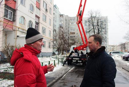 Председатель совета дома № 12 по ул. Сапожковых Геннадий Романов внимательно наблюдает за процессом: «В данный момент пытаемся найти владельцев автотранспорта, чтобы вышка могла подъехать… Вообще задача председателя совета дома – объединять людей, уважать мнение каждого. Здесь нужна, с одной стороны, настойчивость, а с другой - тактичность, умение найти индивидуальный подход, чтобы учитывать все пожелания и предложения».