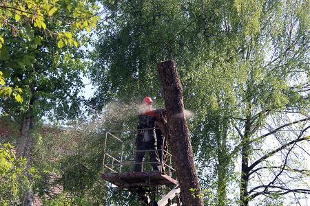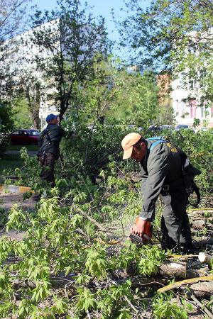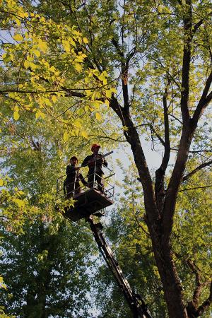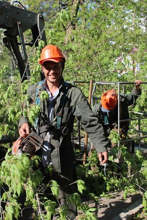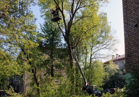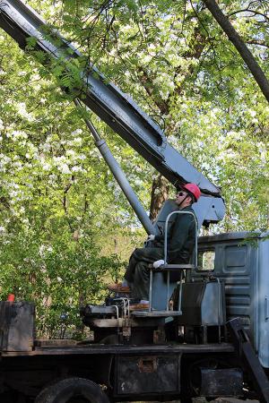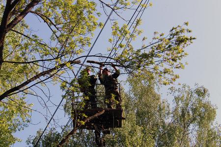 На фото: обрезку и валку деревьев производят рабочие люльки Алексей Федяченко и Александр Курчатов.