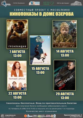 В августе Культурный центр «Дом Озерова» и ГАУ МО «Мособлкино» приглашают на кинопоказы художественных и анимационных фильмов.