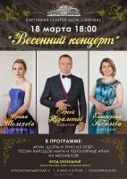18 марта в Картинной галерее «Дом Озерова» состоится «Весенний концерт» с участием вокалистов Екатерины Ковалевой (сопрано), Ирины Шелеховой (сопрано), Сергея Туралетова (баритон). Здесь прозвучат арии, дуэты и трио из опер, песни народов мира и популярные арии из мюзиклов.