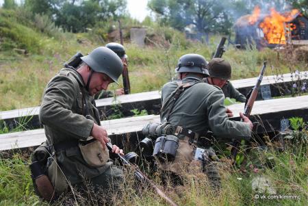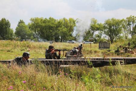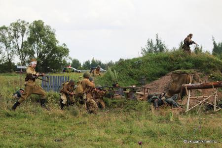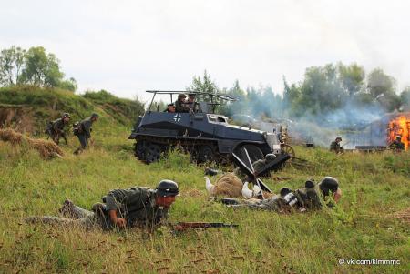 Перед зрителями реконструкции предстала деревушка, жители которой берут под покров нескольких раненых красноармейцев. Появляются полицаи и силой гонят найденных бойцов к повозке, чтобы сдать их в немецкую комендатуру. Женщины и старики пытаются отбить своих, но попытки тщетны... В деревню въезжает немецкий грузовик с солдатами Вермахта, которые начинают наводить здесь свои порядки. В это же время, видя ход событий, к дороге ползком продвигаются партизаны. Один из них без оружия выходит к немцам, и пока те мешкаются, его товарищи открывают стрельбу по фашистам. Завязывается небольшой бой. Немцы отступают за подмогой... Спустя некоторое время в деревню входит более крупный отряд немцев (ДЕМАГ и пехота Вермахта), и вновь завязывается неравный бой. Немцы вызывают на помощь авиацию, применяют минометы. На подмогу обороняющимся из соседней деревни приходят бойцы Красной Армии, и немцы оказываются в клещах. Ожесточенные бои заканчиваются победой партизан и советских солдат.