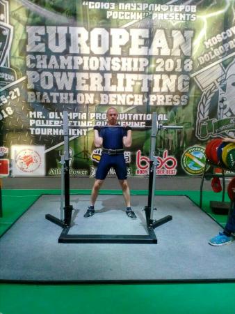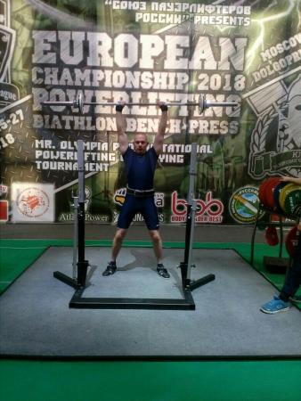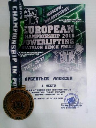 На соревнованиях Алексей Владимирович занял первое место в дивизионе «армейский жим многоповторный» в категории до 80 кг. По итогам чемпионата спортсмен получил золотую медаль, диплом за первое место и звание чемпиона Европы по тяжёлой атлетике.