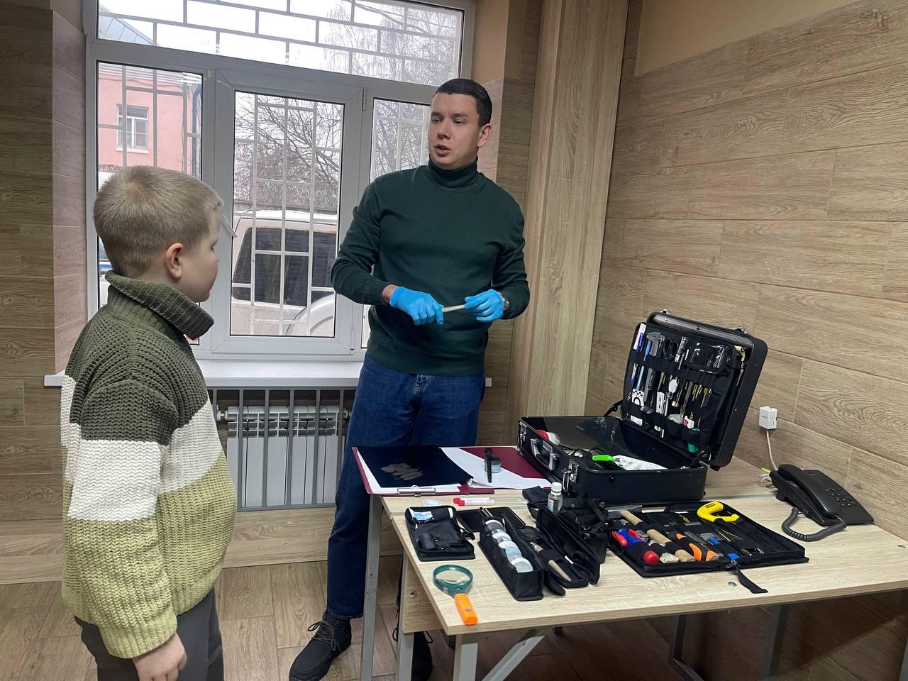 Эксперт-криминалист рассказал мальчику о своей работе, показал, как как на месте происшествия обнаруживаются следы преступления, как они закрепляются, и как производится их изъятие.