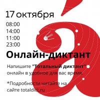 Заходите на страницу totaldict.ru 17 октября в 8:00, 11:00, 14:00 или 23:00 (время московское) и печатайте текст диктанта в специальном окне под онлайн-трансляцию.