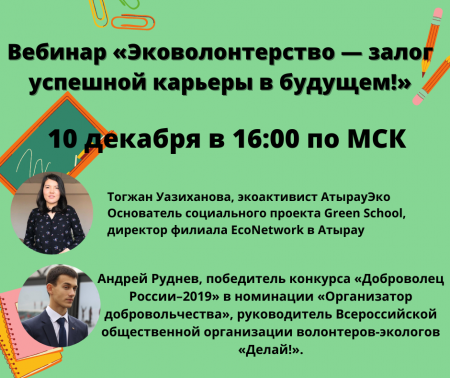 10 декабря 2020 года в 16:00 по мск пройдет бесплатный вебинар для студентов и преподавателей ссузов «Эковолонтерство — залог успешной карьеры в будущем!». Экоактивисты России и Казахстана поделятся, как помогать окружающей среде в городе и на заповедных территориях, получая навыки, полезные для профессионального становления.
