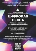 9 апреля Коломенский учебный центр проведет творческую олимпиаду по информатике «Цифровая весна» для школьников 6-7 классов. Олимпиада состоится при поддержке Администрации Городского округа Коломна. Победители получат ценные подарки, а все участники - памятные сувениры и сертификаты.