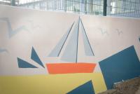 Четыре ярких цвета, геометрические формы и детская фантазия – вот «рецепт» необычного морского пейзажа, который появился на бетонных подпорных стенах по периметру гимназии № 8. Его авторы – ученики и педагоги художественной школы имени народного художника РФ М.Г.Абакумова.