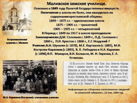 Маливская школа Городского округа Коломна отметила 175 лет. Это одно из старейших образовательных учреждений нашего муниципалитета, открытое в 1849 году Палатой Государственных имуществ в селе Маливо Егорьевского уезда Рязанской губернии.