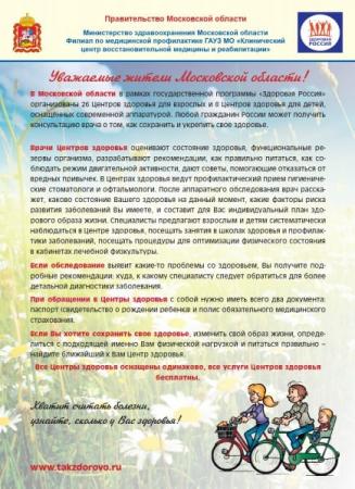 В Московской области организованы 28 Центров здоровья для взрослых и 8 Центров здоровья для детей. Центры здоровья функционируют в рамках государственной программы по формированию здорового образа жизни «Здоровая Россия». Специалисты Центров здоровья дают бесплатные консультации по сохранению и укреплению здоровья.