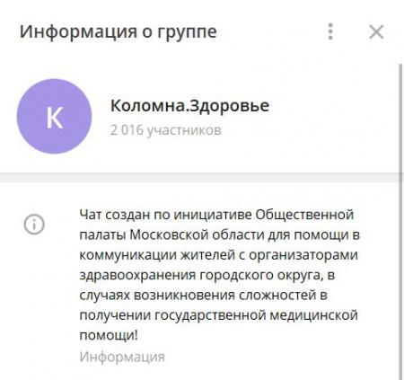 Общественная палата Московской области создала открытый Telegram-чат для оперативного реагирования на конкретные проблемы и сложности в получении медицинской помощи, а также внесения предложений по улучшению работы медучреждений в муниципальных округах Московской области.