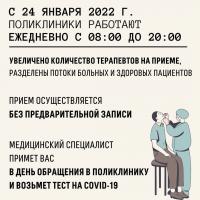 ⚠️ С 24.01.2022 г. поликлиники изменяют режим работы: они будут работать ежедневно с 8:00 до 20:00. Теперь, чтобы не ждать визита врача на дом, пациенты, у которых наблюдаются признаки ОРВИ - кашель, насморк, но температура ниже 38 °C, могут самостоятельно посетить поликлинику без предварительной записи.