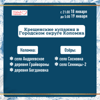 Напомним, что в православный праздник для жителей округа будут оборудованы три купели в Коломне - в селе Андреевское, в деревнях Грайвороны и Богдановка. Ещё две площадки будут в Озёрах - в Сосновке и Сенницах-2. Все места, кроме последнего, оборудованы крытыми купелями. В Сенницах-2 можно будет окунуться в специально вырубленную в пруду иордань.