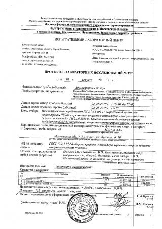 Протокол лабораторных исследований атмосферного воздуха от 03.08.2018 г.