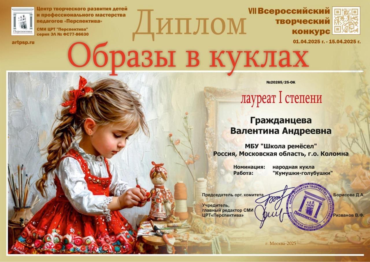 Валентина Андреевна Гражданцева, преподаватель Школы ремёсел, признана Лауреатом I степени в VII Всероссийском творческом конкурсе декоративно-прикладного искусства «Образы в куклах».