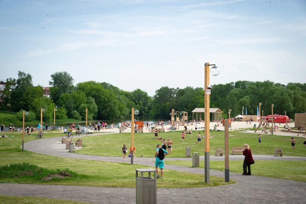 Еще одно место для купания – обновленный пляж на реке Коломенка. Здесь создали прогулочные тропинки, безопасный доступ к воде, детскую игровую зону, поставили сиденья и шезлонги, смонтировали осветительные фонари, оборудовали навесы и санитарные комнаты с душем.