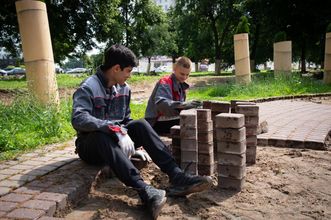 Рабочие используют природосберегающие технологии при благоустройстве сквера в Коломне