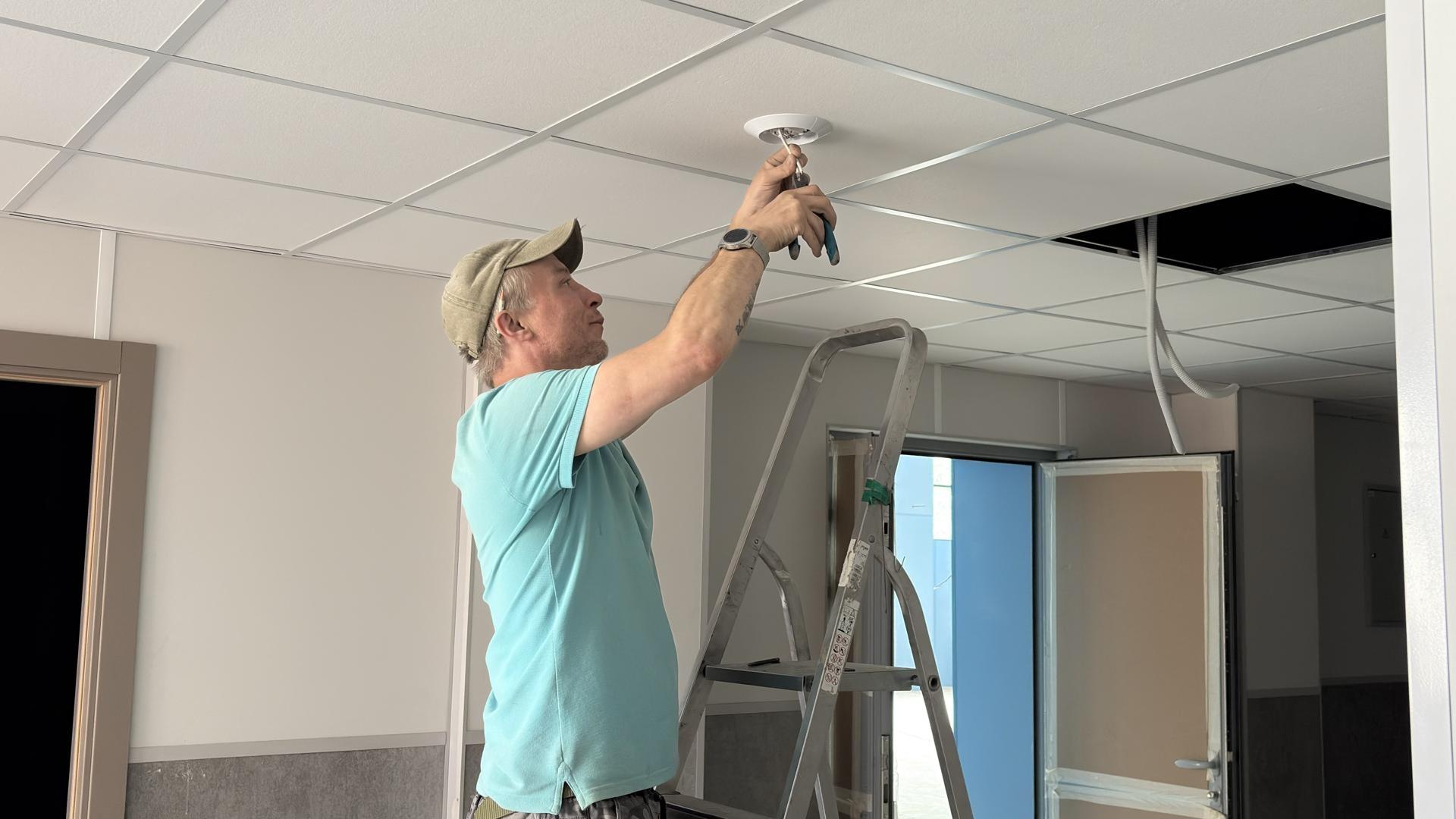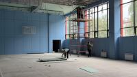 В спортивном зале школы устанавливаются новые подвесные потолки и светодиодные лампы, ведется монтаж спортивного оборудования. Работы в столовой и пищеблоке завершены: установлены декоративные панели, камеры видеонаблюдения и система звукооповещения.