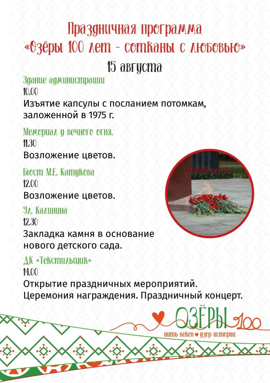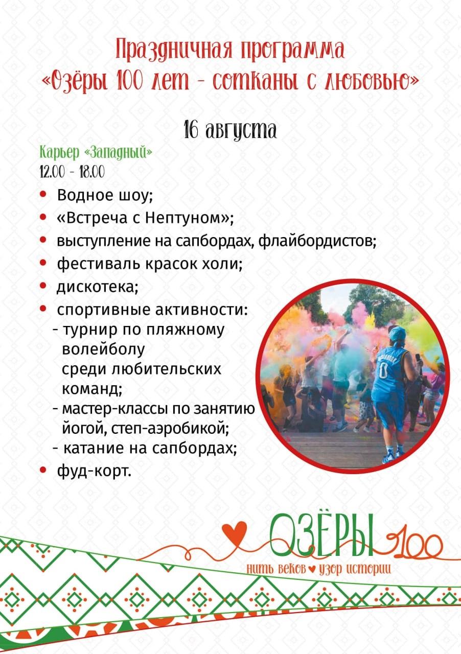 17:00 — На стадионе им. А. Гринина открываются спортивные площадки «Озёры спортивные», где пройдут соревнования по футболу, теннисные матчи и многочисленные веселые старты.