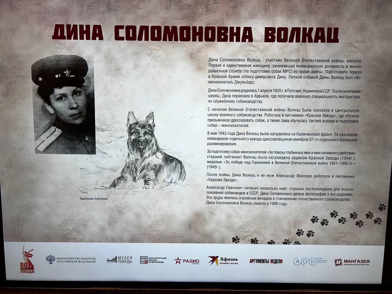 Минно-розыскная овчарка Джульбарс обнаружила более семи тыс. мин и снарядов, а Дина стала первой собакой-диверсантом, уничтожившей немецкий эшелон. Рекс трижды переправлялся через Днепр под обстрелом, доставляя важные донесения, а пес по кличке Бобик за три года войны помог эвакуировать около 1,5 тыс. человек.